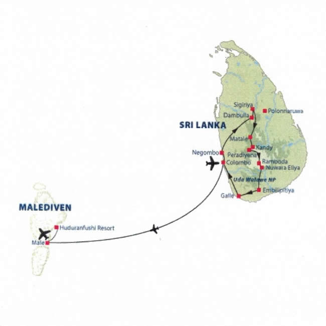 Voor de liefhebber van kleine paradijselijke eilanden met schitterende stranden, snorkelen, duiken, relaxen, etc. is een 5/6-daagse vliegreis verlenging v.v. naar de Malediven eilandengroep mogelijk, op ruim 1 uur vliegen van Colombo. De Malediven is een eilandengroep van 1190 eilandjes, waarvan slechts 202 zijn bewoond en 90 eilandjes geschikt zijn voor toerisme, met Male als hoofdstad en luchthaven.